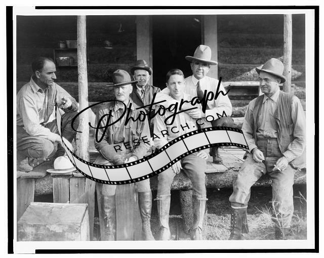 Hunters,posed for group,sitting on porch of cabin in Idaho,1918-1920,Otto Jones