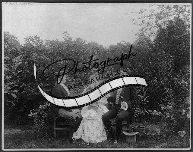 Young Woman,Bouquet of Flowers,Garden Bench,2 men,c1900