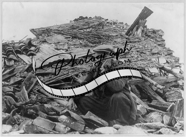 Man on pile of debris,after an earthquake,c1961,rubble