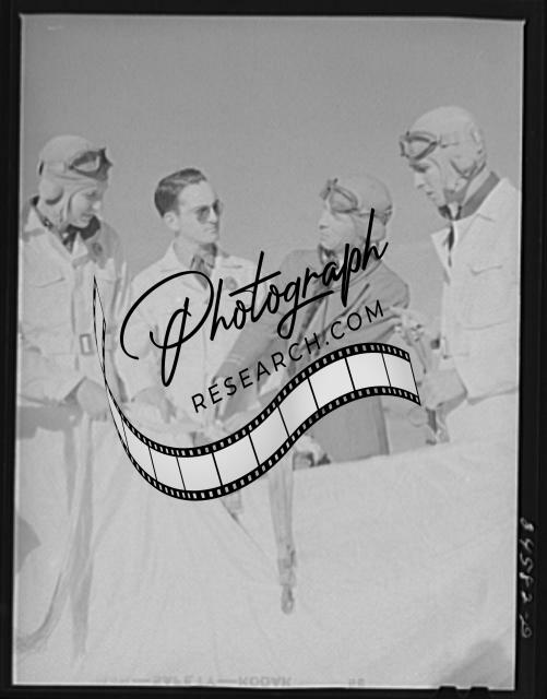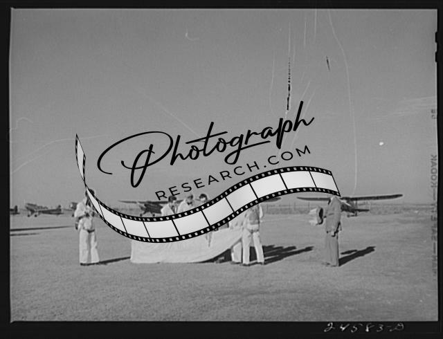 Title: Instructor explaining operation of parachute to students. Meacham Field, Fort Worth, Texas