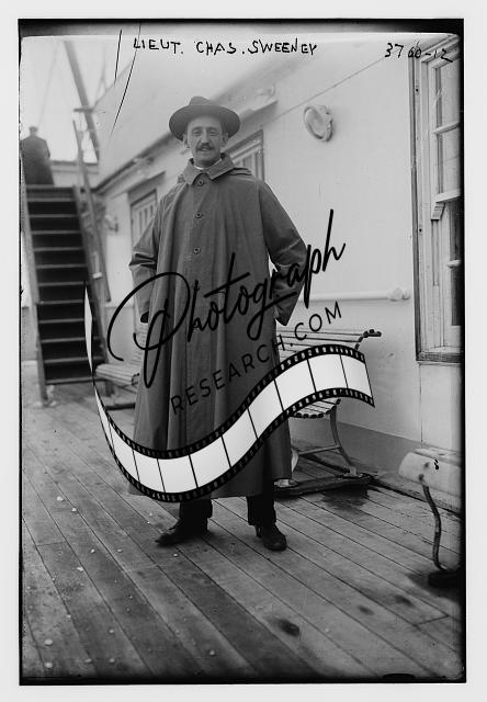 Lieutenant Charles Sweeney,wearing coat,bench,stairs,Bain News Service