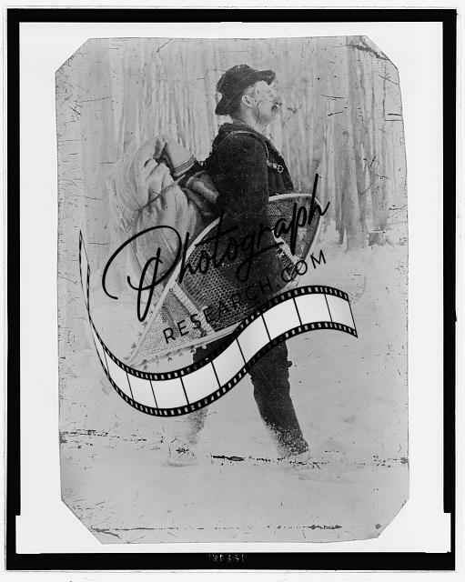 Man carrying a bundle on his back,snowshoes,walking,snowy,1880-1900,Tintype