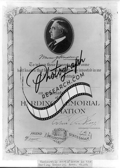 Blank membership certificate in the Harding memorial association,Photo,1923