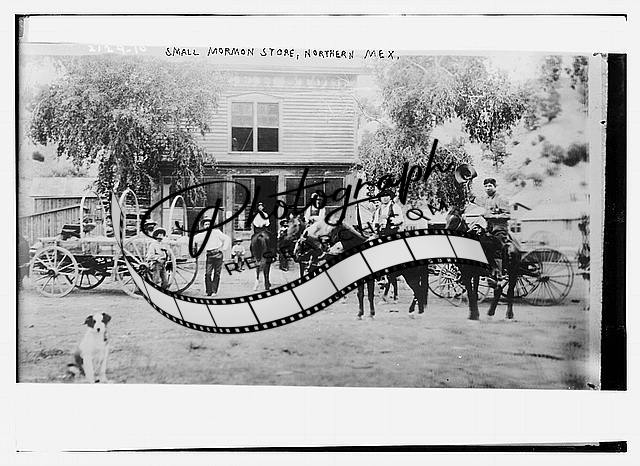 Small Mormon store,northern Mexico,dog,men on horseback,Bain News Service