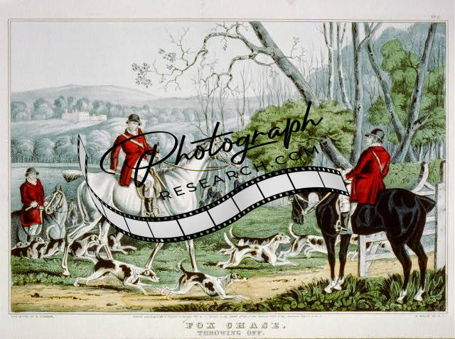 Fox chase: Throwing off,c1846,Currier & Ives,Photo,men on horseback,dogs