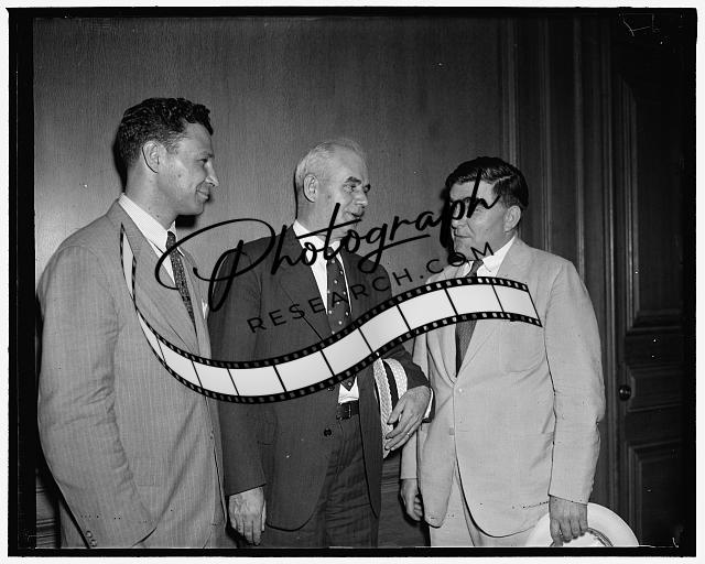 Title: Labor Secretary . Washington, D.C. June 17. Secretary of Labor Frances Perkins announcing to newspaper men today the appointment of a three man board to mediate all current steel disputes. Charles P. Taft was named Chairman of the Board with Lloyd R. Garrison and assisitant Secretary of labor Edward F. McGrady as the other members. 6/17/37