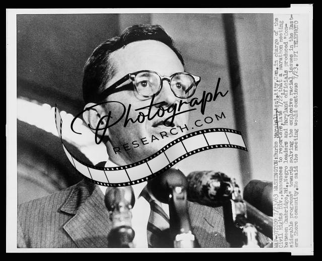 Assistant Attorney General for Civil Rights Division Burke Marshall, head-and-shoulders portrait, standing behind microphones