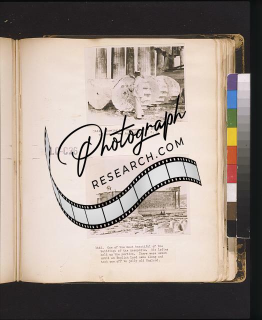 Summary: Photographs show the Parthenon with scaffolding and Frank Carpenter with Mrs. C.D. Morrris with columns at the Acropolis, Athens, Greece.