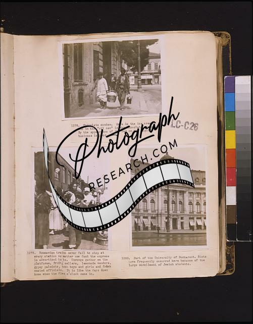 Summary: Photographs show scenes in Romania including: a porter carrying a large load from a boat on the Danube River, the Romanian Athenaeum concert hall, Bucharest, and two women wearing kerchiefs on their heads.