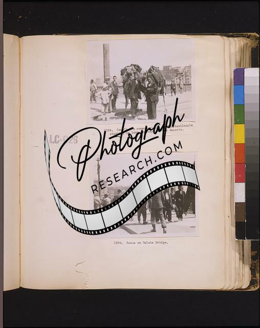 Summary: Photographs show a man with a cart and donkey and porters carrying baskets on the Galata Bridge with Galata Tower in the background, Istanbul, Turkey.