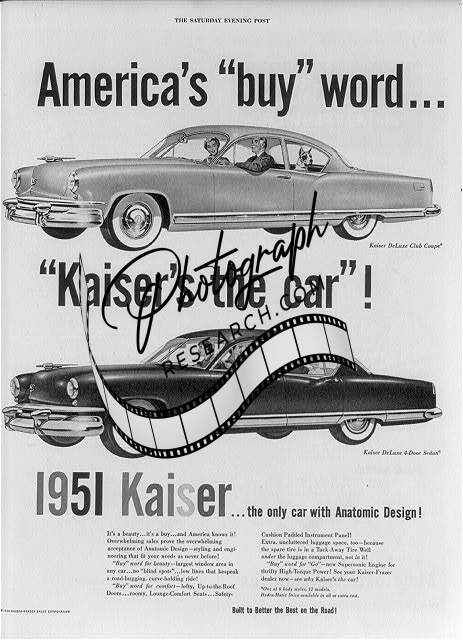 Advertisement illustrated with a Kaiser Deluxe Club Coup and a Kaiser Deluxe 4-door Sedan.