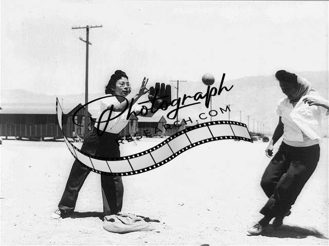 Girls of Japanese Ancestry playing Softball,War Relocation Authority Center,1942