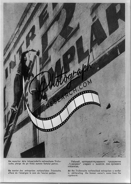 At the Trichorache nationalized enterprises a worker is obliterating the former owner's name from the signboard