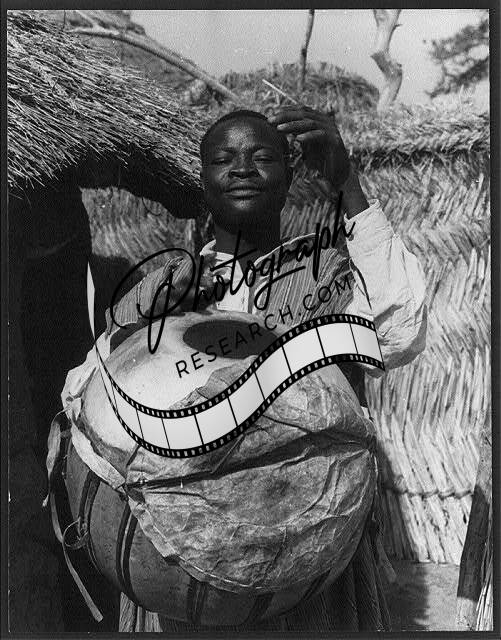 Michel Yougma, a Mossi musician of the court of the chief of Koupéla, Upper Volta, playing a gourd drum at a harvest feast
