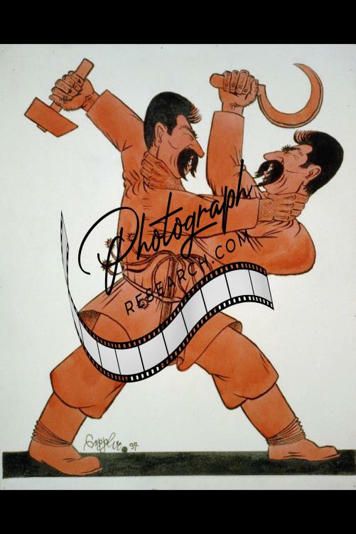 Joseph Stalin as Siamese twins fighting each other,hammer,sickle,1937