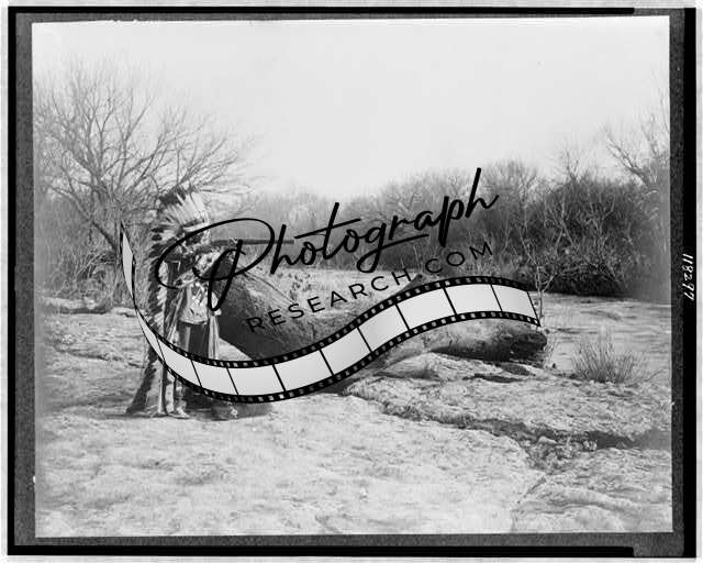 A Pawnee Indian brave,wearing full headdress,aiming rifle,c1908,North America