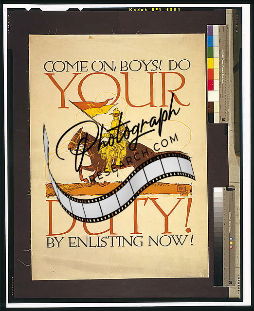 Come on,boys! Do your duty by enlisting now!,1917,Soldier carrying flag,horse