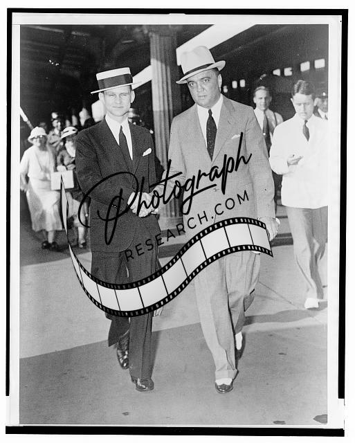 Photograph shows J. Edgar Hoover congratulating Melvin H. Purvis as they shake hands upon his arrival at the train station in Washington, D.C.