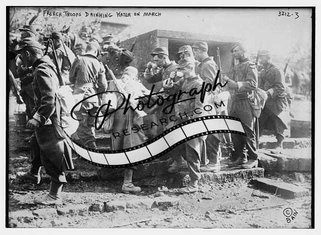 French troops drinking water on march,Soldiers,guns,cups,men,Bain News Service