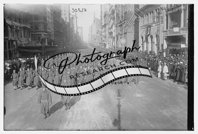 308th,Men marching down street,American flags,spectators,Bain News Service,2