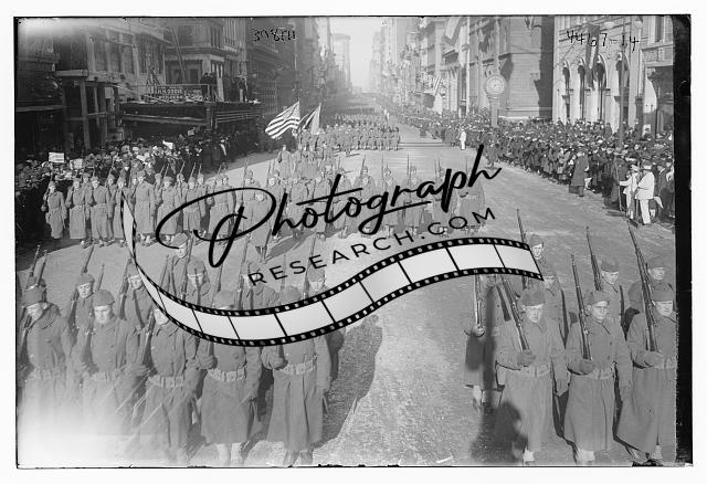 308th,Men marching down street,American flags,spectators,Bain News Service