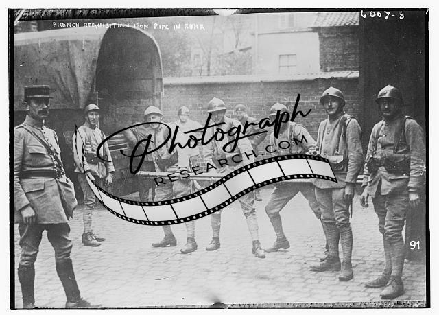French requisition iron pipe,trucks,military personnel,soldiers,Ruhr,Germany