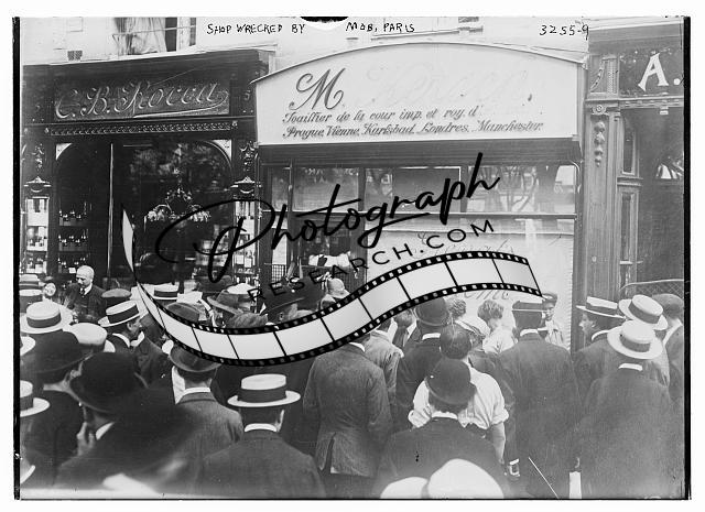 Shop wrecked by mob,Paris,France,store fronts,crowd gathered,C.B. Rocca sign