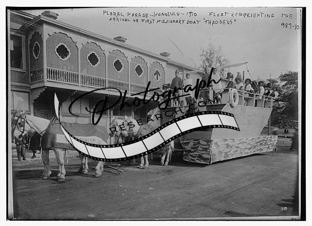 Float,arrival of first missionary boat 'Thaddeus',Floral Parade,Honolulu,Hawaii