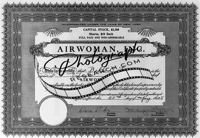 Photo of Stock Certificate,2 shares of AIRWOMAN,INC,Bella C. Landauer,1935