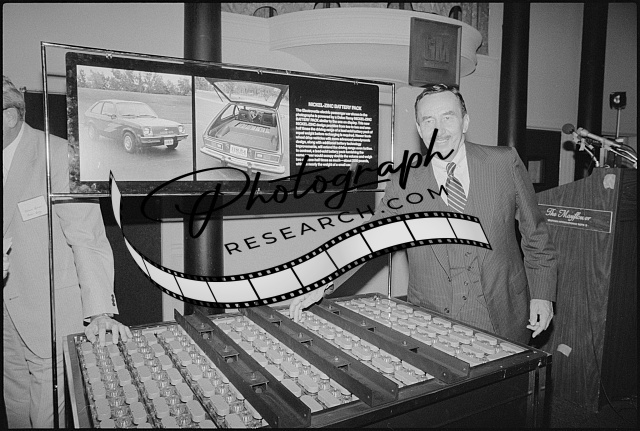 [[Man standing next to a battery pack for the Chevrolet Electrovette, next to a l