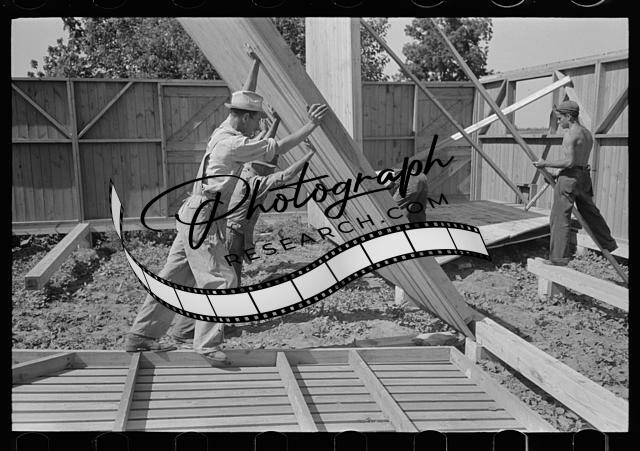 Title: Finishing food storage gable end in jig. Southeast Missouri Farms Project