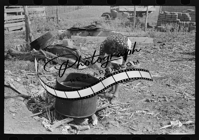 Title: Spanish-American FSA (Farm Security Administration) client breaking up solidified grease before using it in soap making, Taos County, New Mexico.