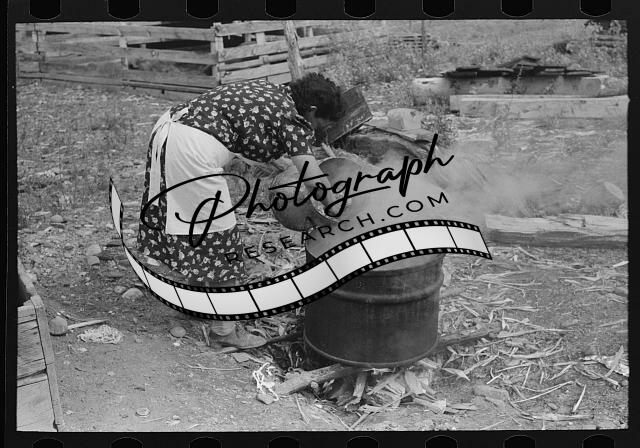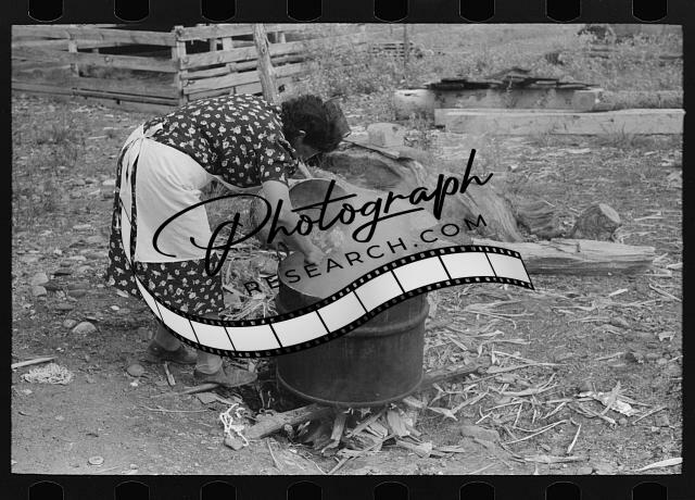 Title: Spanish-American FSA (Farm Security Administration) client emptying pail of grease into kettle for purpose of making soap, Taos County, New Mexico