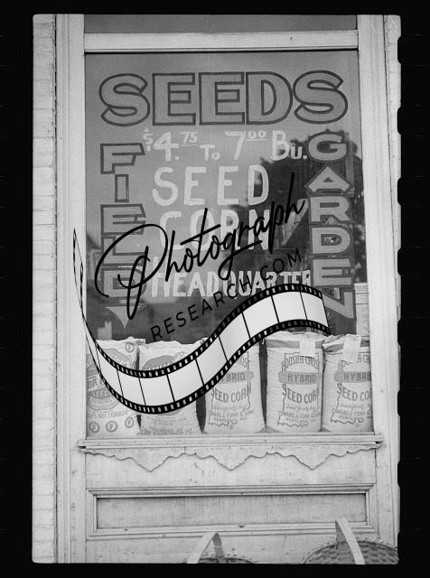 Seed store window,Grayville,Illinois,IL,John Vachon,May 1940,FSA,United States