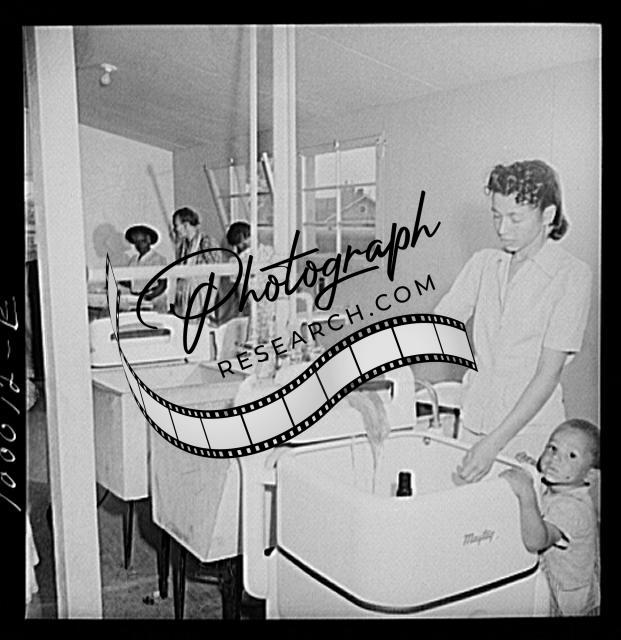 Title: Arlington, Virginia. FSA (Farm Security Administration) trailer camp project for Negroes. Hanging out washing in front of the community building