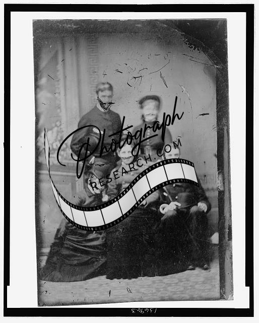 Two women,a man peering over a curtain(?),1880-1900,tintype,portrait photograph