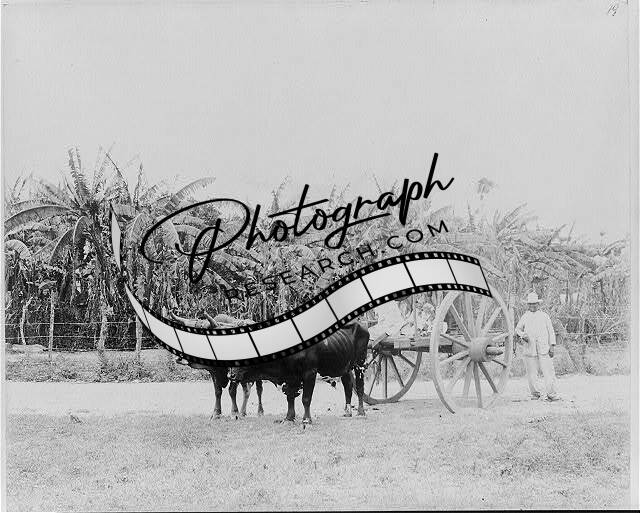 Man,woman,child in ox-drawn cart,1895-1920,Cuba,Trees,oxen,animals