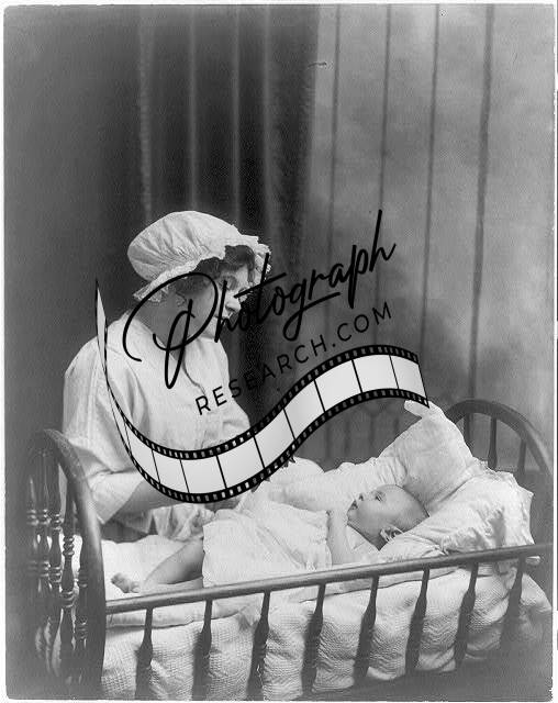 New sister,mother,little girl,cradle,sleeping baby,c1901,Infant
