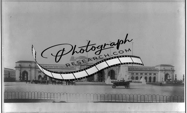 Union Station,Washington,D.C.,exterior view,horse-drawn carriages,people,fence