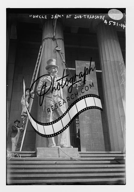 'Uncle Sam' at sub-treasury,statue,men on ladder,Bain News Service