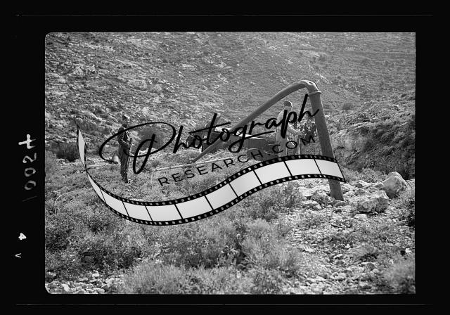 Title: G.O.C. visits overturned locomotive on the Jerusalem Lydda Railroad Line. The crane in process of heaving up the wreck to turn it right side up, with Mr. F.A. Sergeant on bank