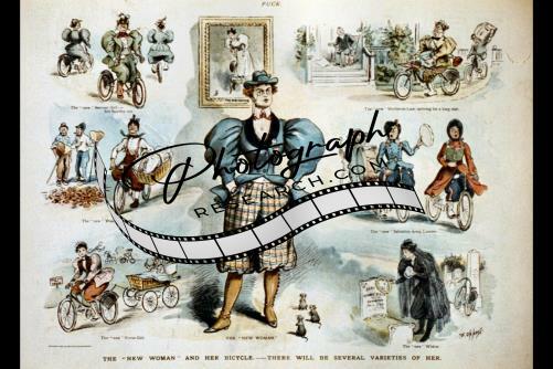 The New Woman,bicycle,caricature,wearing pantaloons,riding bikes,1895,Puck