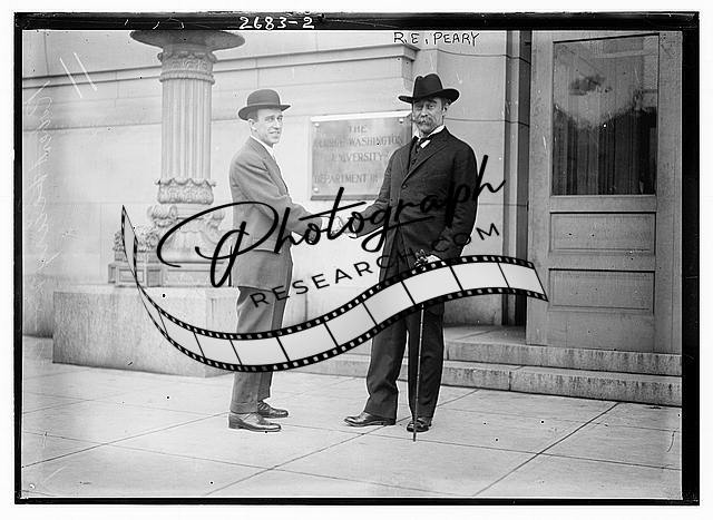 R.E. Peary shaking hand with man,outside the George Washington University,c1910