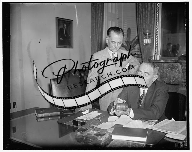Philippine President gets autograph,Manuel Queson,William Bankhead,desk,1937