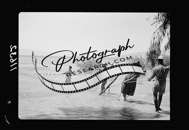 Title: Galilee trip. Tiberias fisheries (Arab). Fishing with drag net. Loading drag net on boat