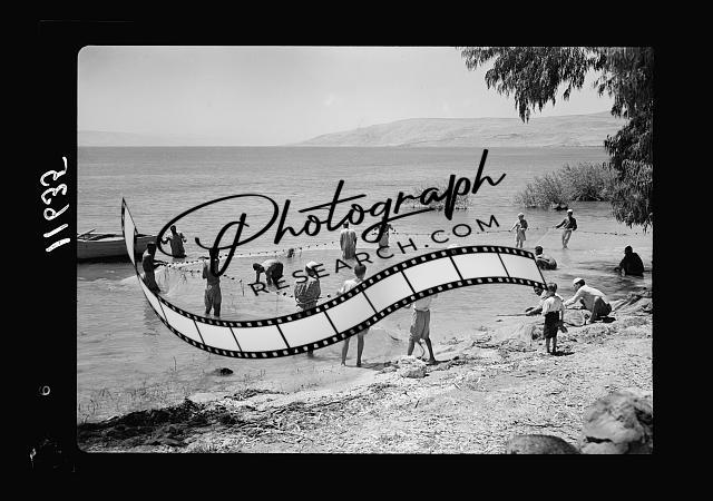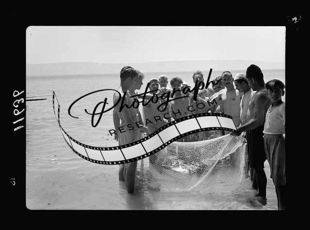 Title: Galilee trip. Tiberias fisheries (Arab). Drawing in the drag net and fishermen showing fish