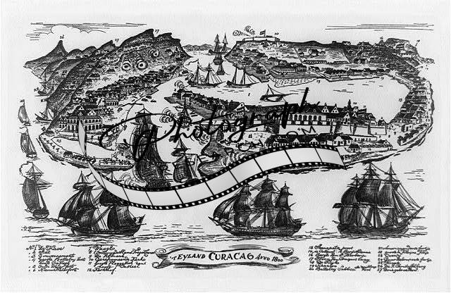 'tEyland Curacao anno 1800,Photo of Map of Curacao,Dutch Antilles,Sailing Ships