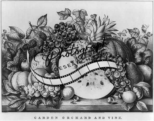 Photo of Garden orchard,vine,c1867,Currier & Ives,pinapple,pear,peaches,grapes