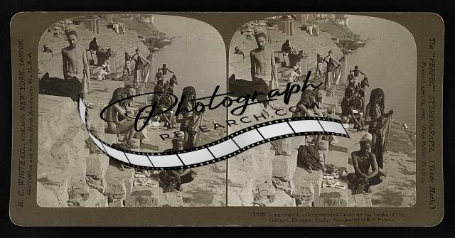 Long-haired,ash-besmeared fakirs on the banks of the Ganges,Benares,India