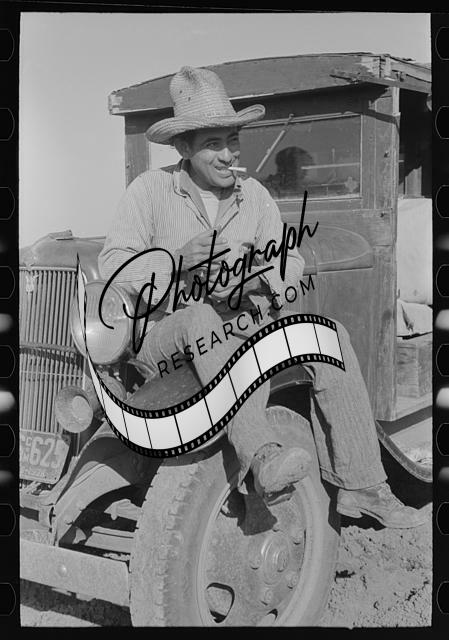 Title: Garage and automobile of small vegetable farmer near Santa Maria, Texas. This farmer said that he found Mexican labor satisfactory. He indicated that the white farmers in this section felt a definite responsibility to the Mexican and saw that he was cared for in bad seasons. He said that two years ago when the vegetable market was off the farmers in this vicinity pitched in and helped feed the Mexicans. He explained that while there was always plenty of fruits and vegetables for the Mexicans that it was impossible for them to subsist on them. They require red beans and corn